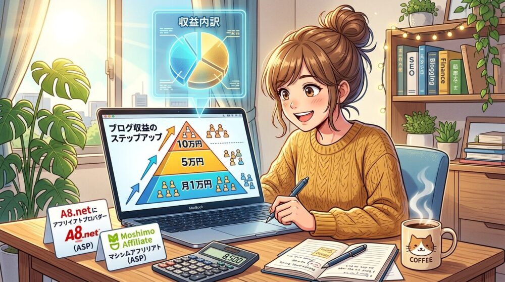クリック単価10円のアドセンスに対し、アフィリエイトは1件成約で数千円〜数万円。同じ1PVでも収益効率がまるで違う。「広告クリックを待つ」から「商品を紹介して報酬を得る」へ――この発想転換が、月1万円の壁を突破する分岐点になる。