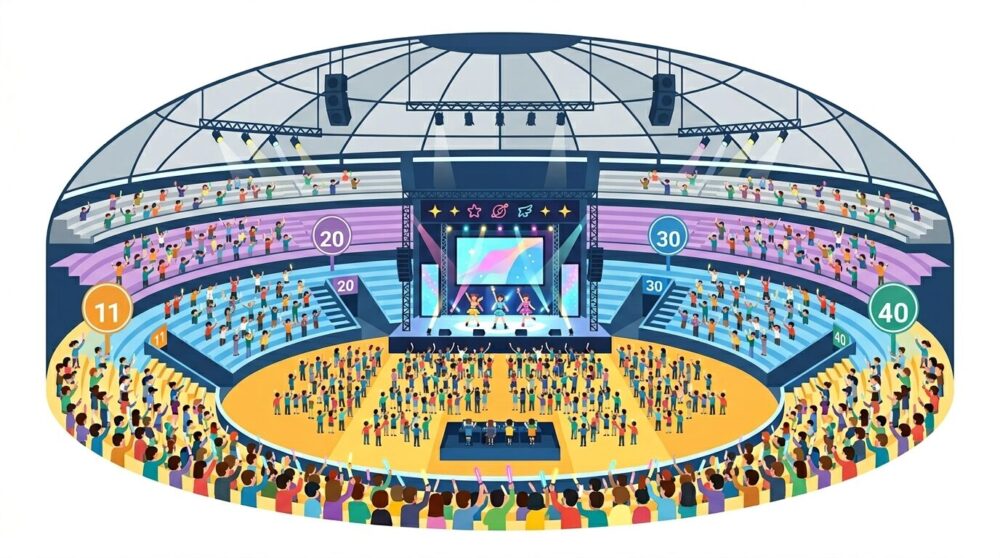 ステージに最も近いエリア。出入口が11番・25番の場合、アリーナのブロック(A〜Kなど)に割り当てられることが多い。センターステージのある公演では360度から見渡せる場合もあり、ファンサをもらいやすい「神席」候補。