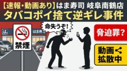 2026年3月20日夜、はま寿司・岐阜南鶉店の駐車場でタバコをポイ捨てした高齢男性が、注意した若者に「俺は空手やってる、命失うぞ」と逆ギレ脅迫。動画がXで拡散中。法的問題点とネットの反応を解説。