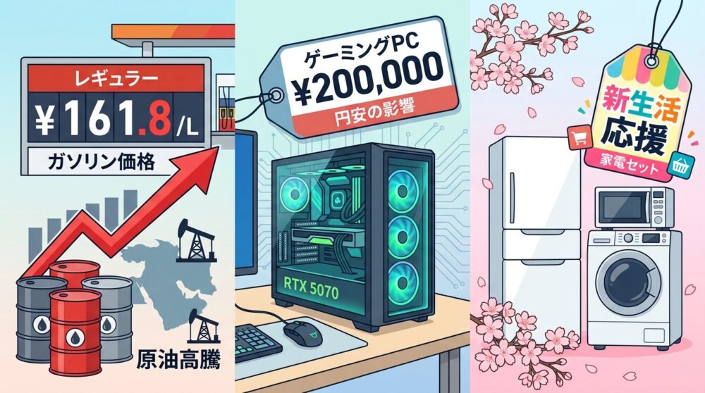 ガソリンは19日から補助金が反映され始めるため、今すぐ満タンにする必要はありません。ただし補助金は「170円超の全額補填」であり、補助後も170円前後の高水準が続く点は要注意です。家電は3月決算の今が最大の買い時。迷っているなら動くべきタイミングです。PCは最新RTX 50シリーズが出揃い、20万円前後の予算でミドルハイ構成が組めるようになっています。ただし原油高による部品輸送コスト上昇が今後の価格に影響する可能性もあり、早めの判断が吉と言えます。