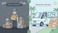 関東と関西の間を走る2台の配送バンが互いに荷物を運び合うイラスト。