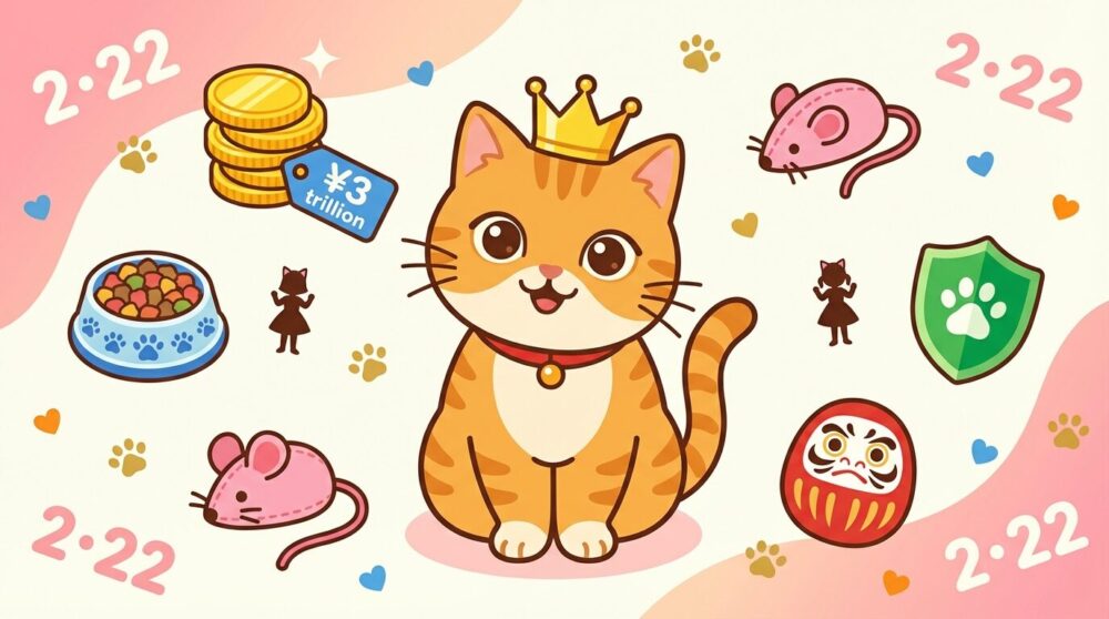 キャットフード・ペット用品市場が最大のボリュームゾーン。国内の猫飼育頭数は犬を超え続けており、プレミアムフードや健康志向商品の需要が年々拡大。ペット保険市場も高成長で、猫の長寿化に伴い月額5,000円〜の保険契約が急増している。猫カフェ・ネコテーマパークは全国500店以上が稼働し、インバウンド需要も加算。猫グッズ・出版・アートも今日だけで全国書店の棚が猫本で占拠された。