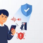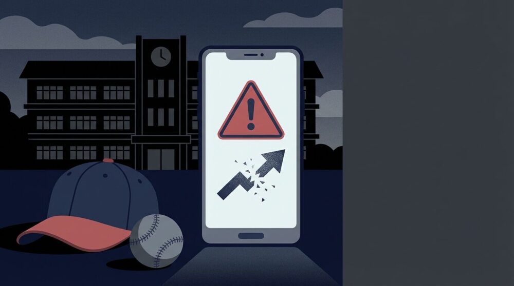 警告表示のスマホと壊れた共有アイコン、野球帽と学校のシルエットで「動画拡散リスク」を象徴したイラスト