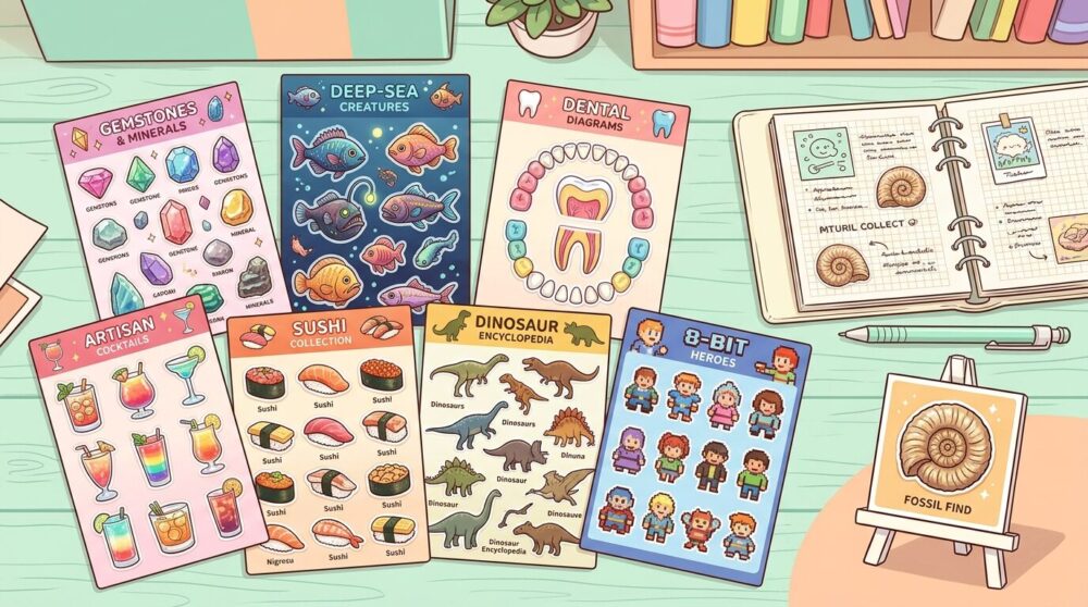 ニッチすぎるモチーフを図鑑風にまとめたデザインが「子ども向けじゃないのに集めたくなる」とSNSでバズり、2026年現在で全95種以上に拡大した。