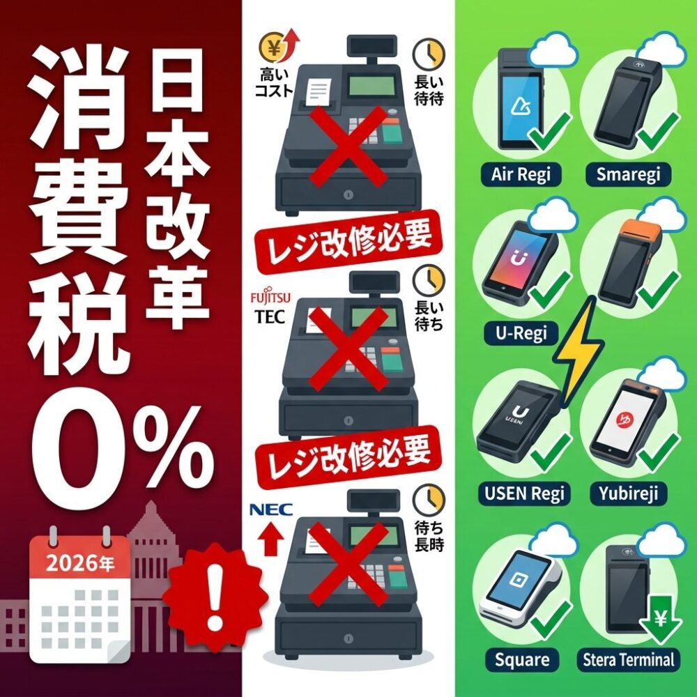 現状は大手レジメーカーが「9カ月〜1年」と慎重姿勢を崩さず、政権内でも2026年度中の実現に対する自信が揺らぎ始めている。代替案として消費税1%案や後日還付が浮上しており、「ゼロかどうか」より「いつ・どうやって」が焦点になってきた。