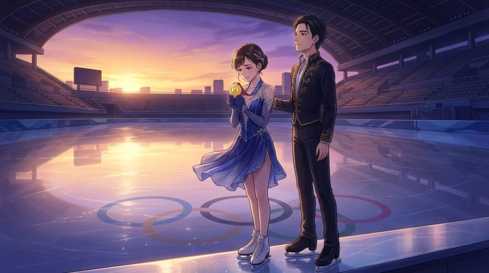 ミラノ五輪フィギュアスケートペア金メダリスト「りくりゅう」をイメージしたアニメ風イラスト。夕暮れに染まるリンクのほとりで金メダルを手に並び立つ2人のスケーターが、達成感と静かな余韻の中で未来を見つめるビタースイートなシーン。