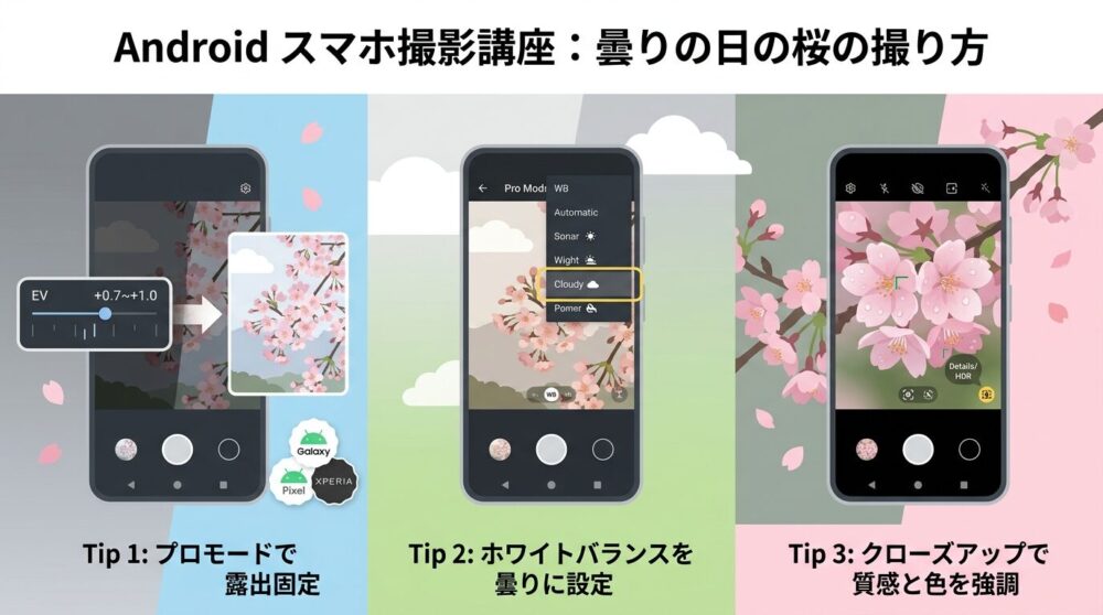 ひとつ目は光量不足。曇り空は光が雲に拡散され、花びらに届く光が弱くなる。ふたつ目は白飛び。空と桜を同時に撮ると、カメラのAIが空の明るさに合わせて露出を調整してしまい、桜が暗く潰れる。みっつ目はピンクの退色。光が弱いとスマホが「白っぽい被写体」と認識し、桜本来のピンクが薄くグレーがかる。