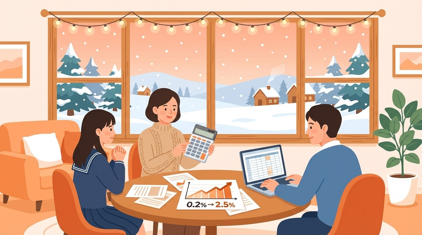2026年1月時点で、固定方式は2.512%、見直し方式(変動)は1.700%。一見、変動のほうが安く見える。だが日銀がさらに利上げすれば、5年後の見直しで3%に迫る可能性がある。返済期間15〜20年のあいだ「いつ上がるか」とビクビクするより、「これ以上は増えない」という安心を買うほうが賢い。上限3%という天井がすぐそこにある今、固定で確定させる判断が効く。
