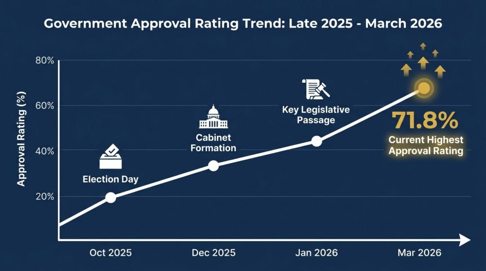 2026年3月2日発表のJNN世論調査で71.8%(前回比+1.9pt)を記録した高市内閣。衆院選大勝・第2次内閣発足という追い風を受け、主要各社の調査が軒並み高水準で揃っている。