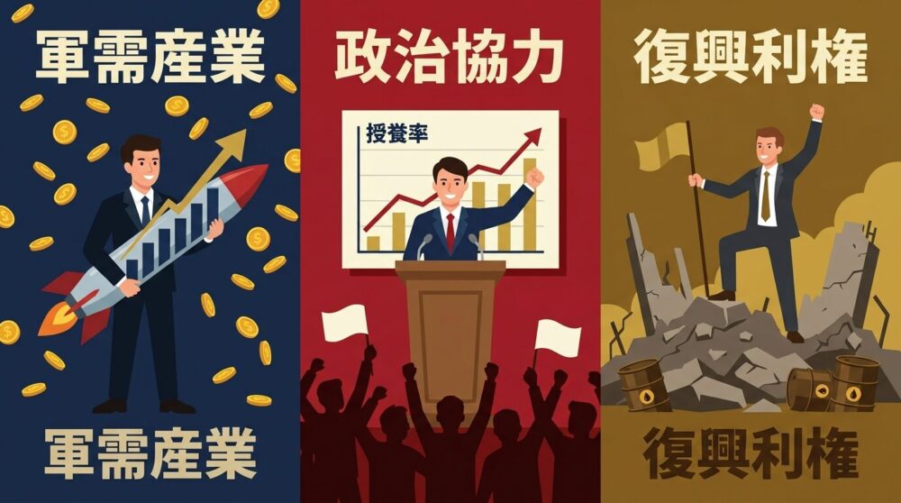 破壊された土地の上に、誰かのビジネスが芽を出す。この構図はイラク戦争後の石油利権争いから中東・アフリカの紛争地帯まで、何度も繰り返されてきたパターンです。